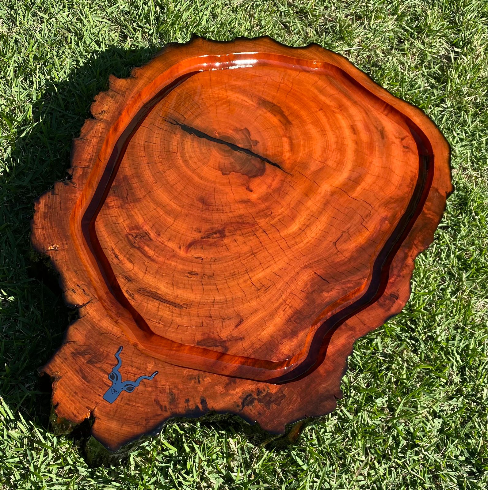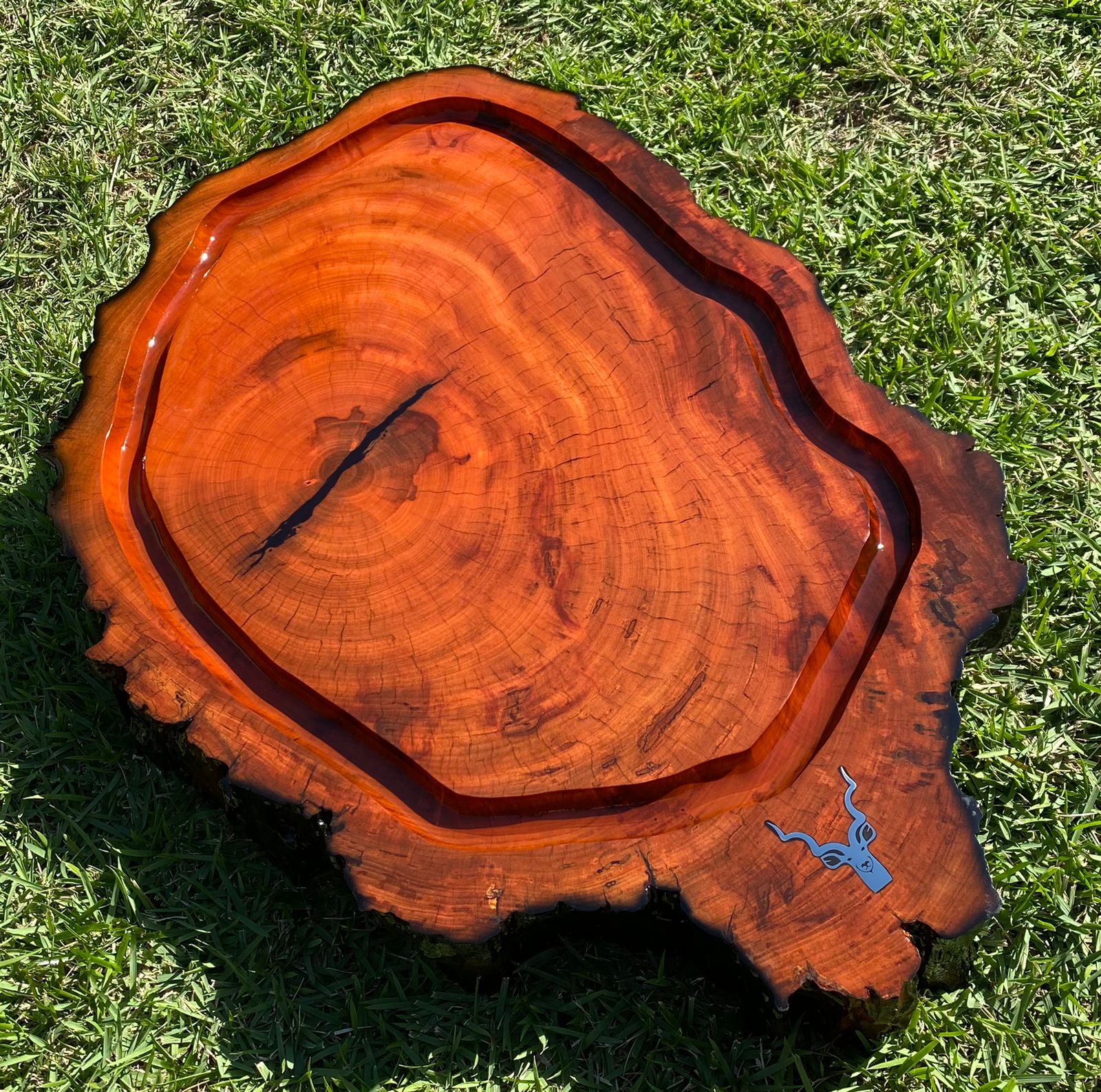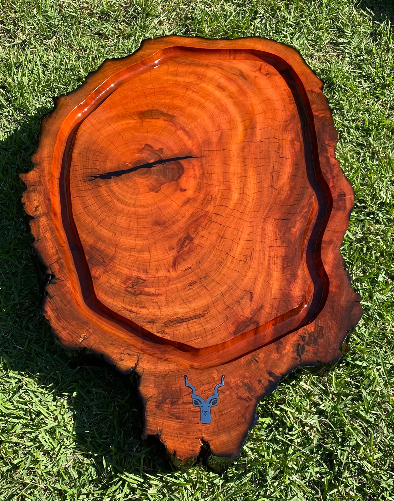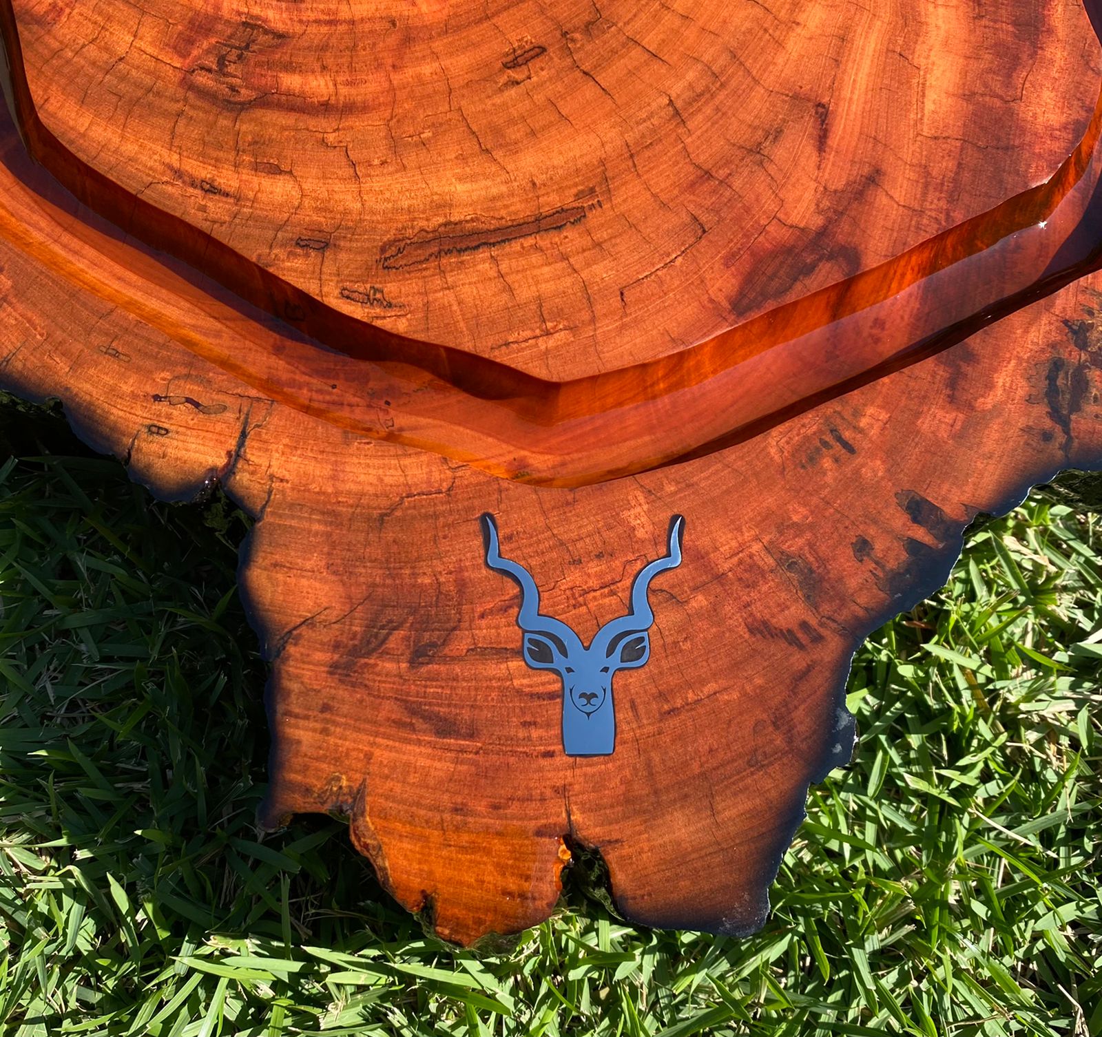 Trabalho todo feito a mão, formato e cor NATURAIS, borda ESTABILIZADA e Antílope em inox marchetado na madeira.